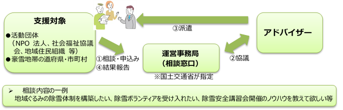 国土交通省は、地域における共助除排雪体制づくりを促進するため、令和元年11月1日より、豪雪地帯の自治体及び活動団体等向けの相談窓口を開設し、克雪体制づくりアドバイザーの現地派遣を行います。