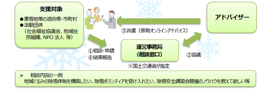 ・更なる促進のため、「克雪体制づくりアドバイザー派遣制度」(平成30年度~)により、体制整備の課題に直面している豪雪地帯の自治体や活動団体等に対し、専門的な知識や豊富な経験を有する者(全18名)を派遣し、助言等を行っており、令和2年度は10月1日より相談窓口を開設します(別紙1、別紙2を参照)。