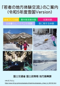 | 国土交通省は、雪国ならではの体験が可能なプログラムを取りまとめ、ホームページにおいて 公表しましたのでご案内します。大学生をはじめとする若者の皆様に積極的にご参加いただくこ とを期待しています。 |