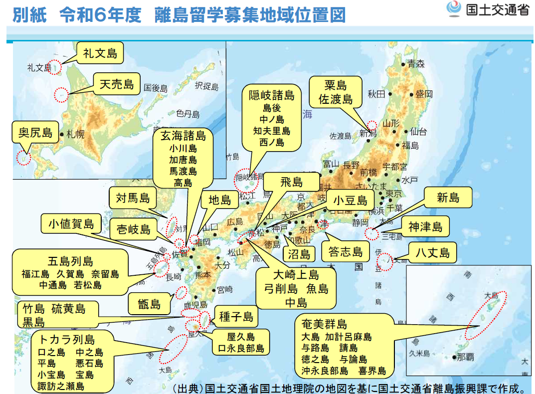 | 島外の小・中学生、高校生が豊かな自然環境や多くの文化・伝統等が残っている離島で暮らし、勉学等に励む「離島留学」を実施する学校が近年増加しています。昨年度改正された離島振興法においても新たに「離島留学」が法に明記される等、注目を集めているところです。 このたび離島関係自治体の協力を得て、令和6年度の離島留学募集状況の情報をとりまとめました。あわせて、離島留学を希望する方向けの説明会や体験入学等を実施している学校のリストもとりまとめましたので、具体的な受入れの可否等詳細については、それぞれの学校の問い合わせ先までご連絡ください。 ※国土交通省では、離島振興に資する取組として、離島活性化交付金を通じて離島留学に係る受入体制の充実等の自治体の取組を支援しています。 |