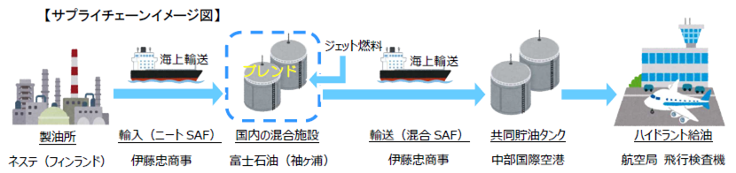 | CO2排出量削減効果の高いSAF※の原料(ニートSAF)を輸入した上で国内にてジェット燃料と混合し、航空機に給油する一連のサプライチェーンを構築するための実証事業を行います。 ニートSAFは、混合SAFに比べて少量の輸送で済むことから、「エコな燃料を、よりエコな方法で輸送する」ことにもつながるもので、今回の実証事業が日本初の取り組みです。 ※SAF(Sustainable Aviation Fuel:持続可能な航空燃料)は、バイオマス原料等を基に製造されたジェット燃料で、通常の燃料と比べて約8割のCO2削減効果があります。 SAFはジェット燃料と混合して使用しますが、ニートSAFは混合前の状態であり、混合後のSAFと比べて、輸送時の物量が少なくなることから、コストや輸送に伴うCO2排出の低減が期待されます。 |
