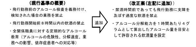 このような状況を踏まえ、運航乗務員において適正な飲酒量に関する理解・意識の徹底を図り、同種事案を防ぐための追加の飲酒基準を設ける予定としております。