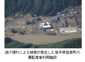 ・岩手県では、多量の土砂や流木を含む洪水により、河川沿いの狭隘な低平地の大部分が浸水したことや記録的な集中豪雨による急激な水位上昇に伴い、小本川沿川の要配慮者利用施設などで逃げ遅れによる被害が発生した。