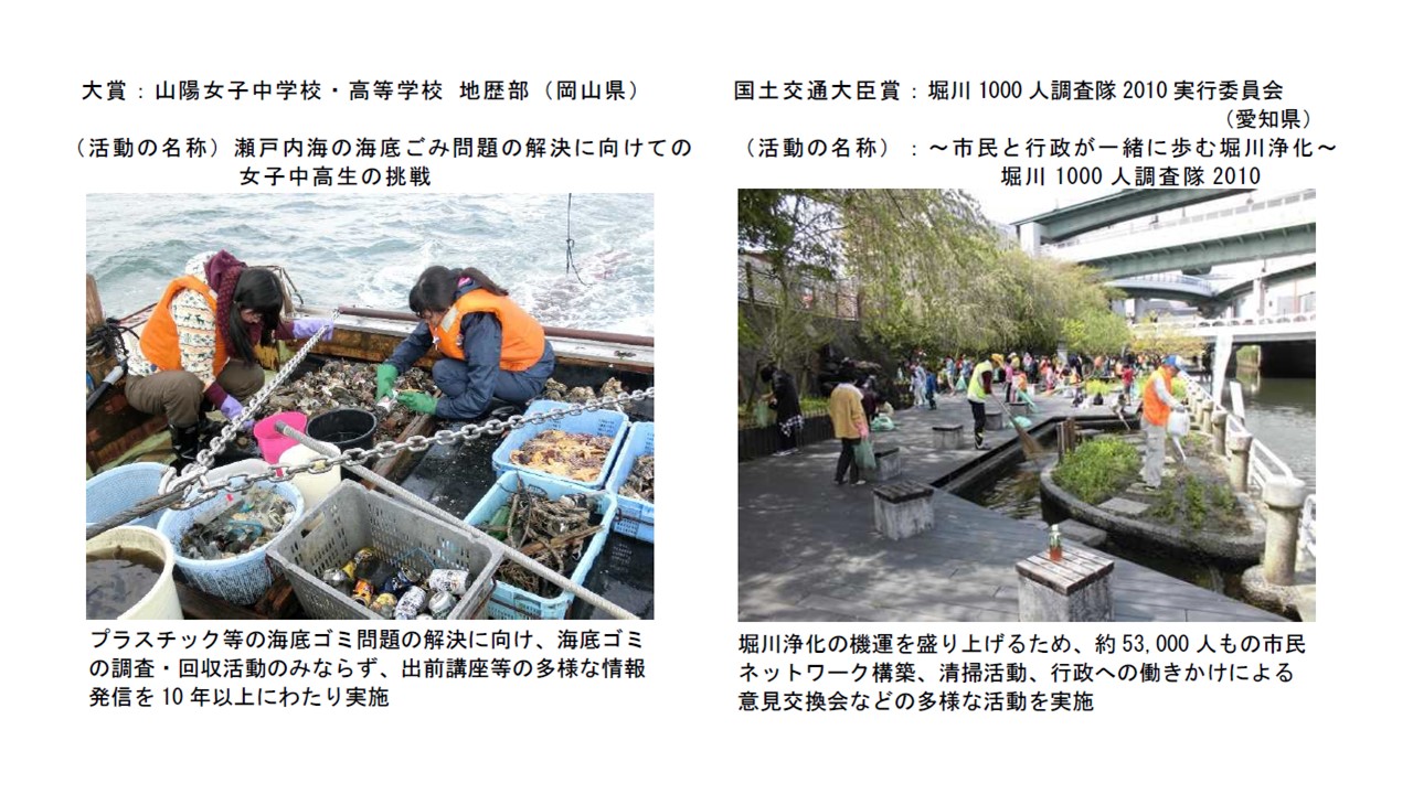 また、「国土交通大臣賞」の受賞者を、官民協働で堀川浄化活動に取り組んでいる「堀川1000人調査隊2010実行委員会」(愛知県)に決定しました。