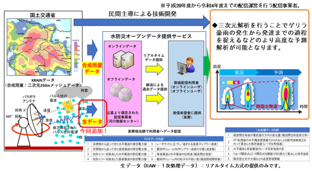 | 国土交通省では、民間事業者が提供するウェブサイトやアプリを通じて広く国民の皆様に河川情報が提供されるよう、「水防災オープンデータ提供サービス」において河川水位等のデータ配信を実施しています。 解析処理により作成した二次元250mメッシュの合成雨量データなどに加え、新たに雨量レーダで観測した解析処理前のデータを配信します。 このデータが活用されることで、三次元解析など民間主導の新たな技術開発が期待されます。 |