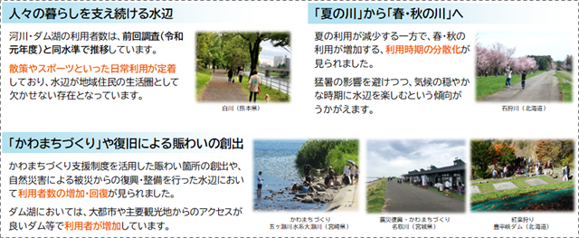 | 「河川水辺の国勢調査」(河川空間利用実態調査・ダム湖利用実態調査)の最新結果(令和6年度)を、これまでのデータとあわせて分析したところ、水辺利用の季節に変化が生じていることが明らかになりました。 河川では、休日の利用者の季節割合が春31%、秋29%、夏23%となり、春・秋が夏を上回りました。近年の猛暑の影響が考えられます。 一方で、河川やダム湖は散策やスポーツなどの日常的な活動の場として安定的に利用されており、身近なオープンスペースとして重要な役割を担っていることも確認されました。 |