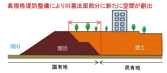 国土交通省では、民間事業者が高規格堤防整備事業に参加しやすい環境を整えるため、民間事業者による川裏法面敷地(高規格堤防の整備により創出される河川空間)の一体的活用を可能とするとともに、工期短縮・コスト縮減のため堤防の盛土工事等と建築物の基礎工事等の一体施工を更に推進します。