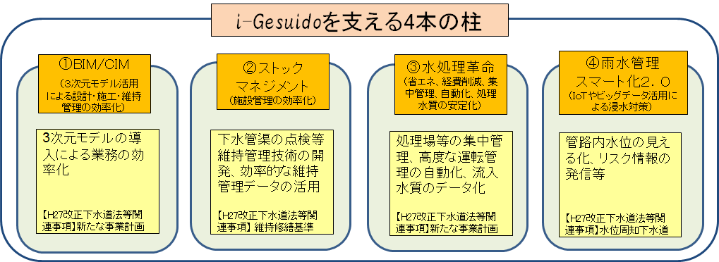 i-Gesuidoは、ICTを活用して効率的な事業実施が可能な4本の柱を中心に施策を展開し、下水道事業へのICTの普及を着実に推進していきます。
