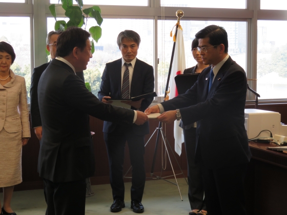 同日12時30分より、国土交通大臣室において、石井啓一国土交通大臣から、林文子横浜市長、福田紀彦川崎市長立ち会いのもと、諸岡正道横浜川崎国際港湾株式会社社長に対し、港湾運営会社としての指定書を交付しました。
