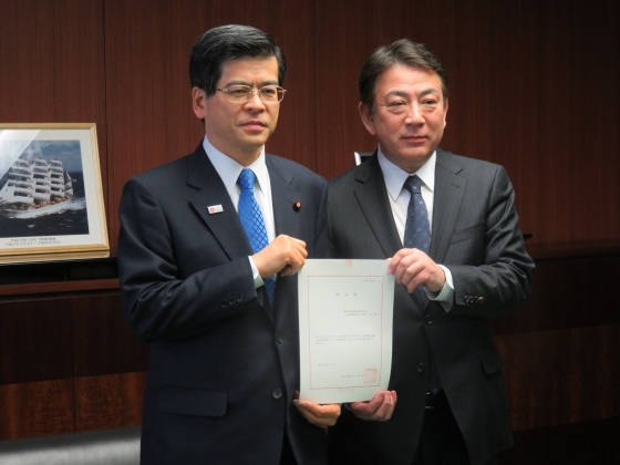平成28年3月4日、石井啓一国土交通大臣から諸岡正道横浜川崎国際港湾株式会社社長に港湾運営会社の指定書を交付しました。