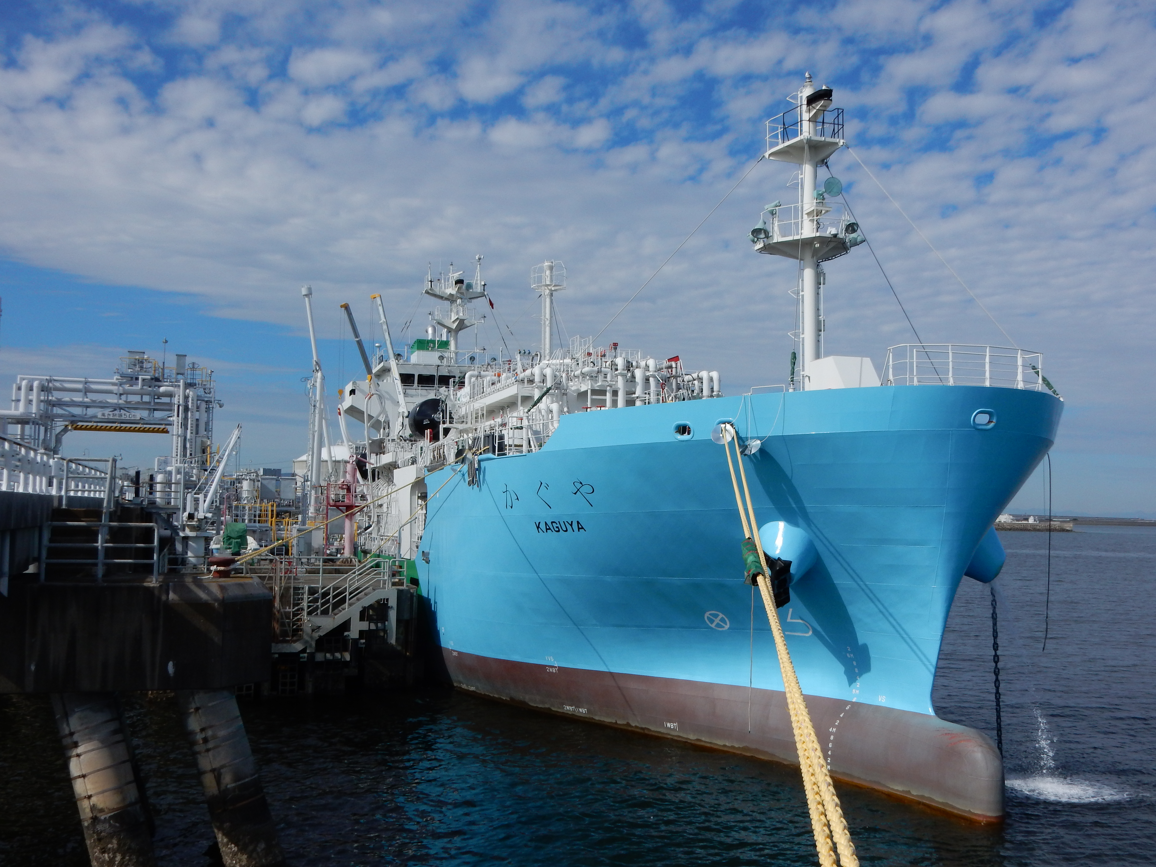 | 国土交通省では、我が国港湾の国際競争力を強化するため、今後増加が見込まれる環境性能に優れたLNG燃料船への燃料供給拠点(バンカリング拠点)形成の取組を支援しています(※1)。 今般、国の支援制度を活用して建造されたLNGバンカリング船(※2)「かぐや」が、我が国初となるSTS方式(※3)でのLNG燃料供給を実施しました。 |