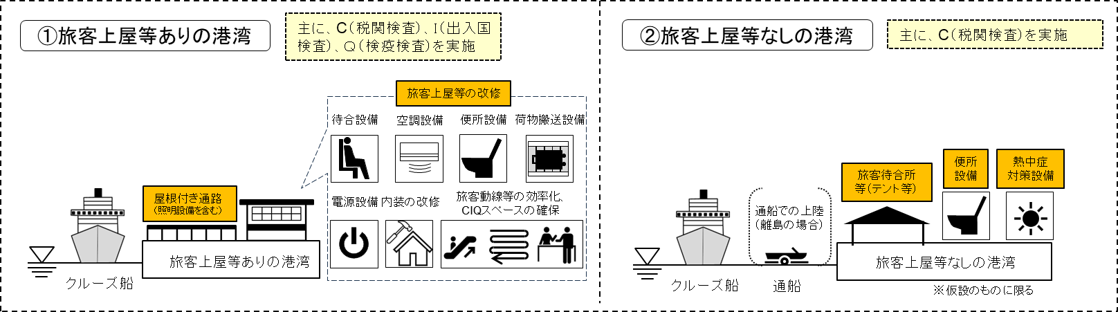 | 国土交通省では、港湾におけるクルーズ旅客の利便性や安全性の向上等を図るための事業に対して補助を行っています。 令和7年度第1回公募の結果、7事業について実施を決定しました。 |