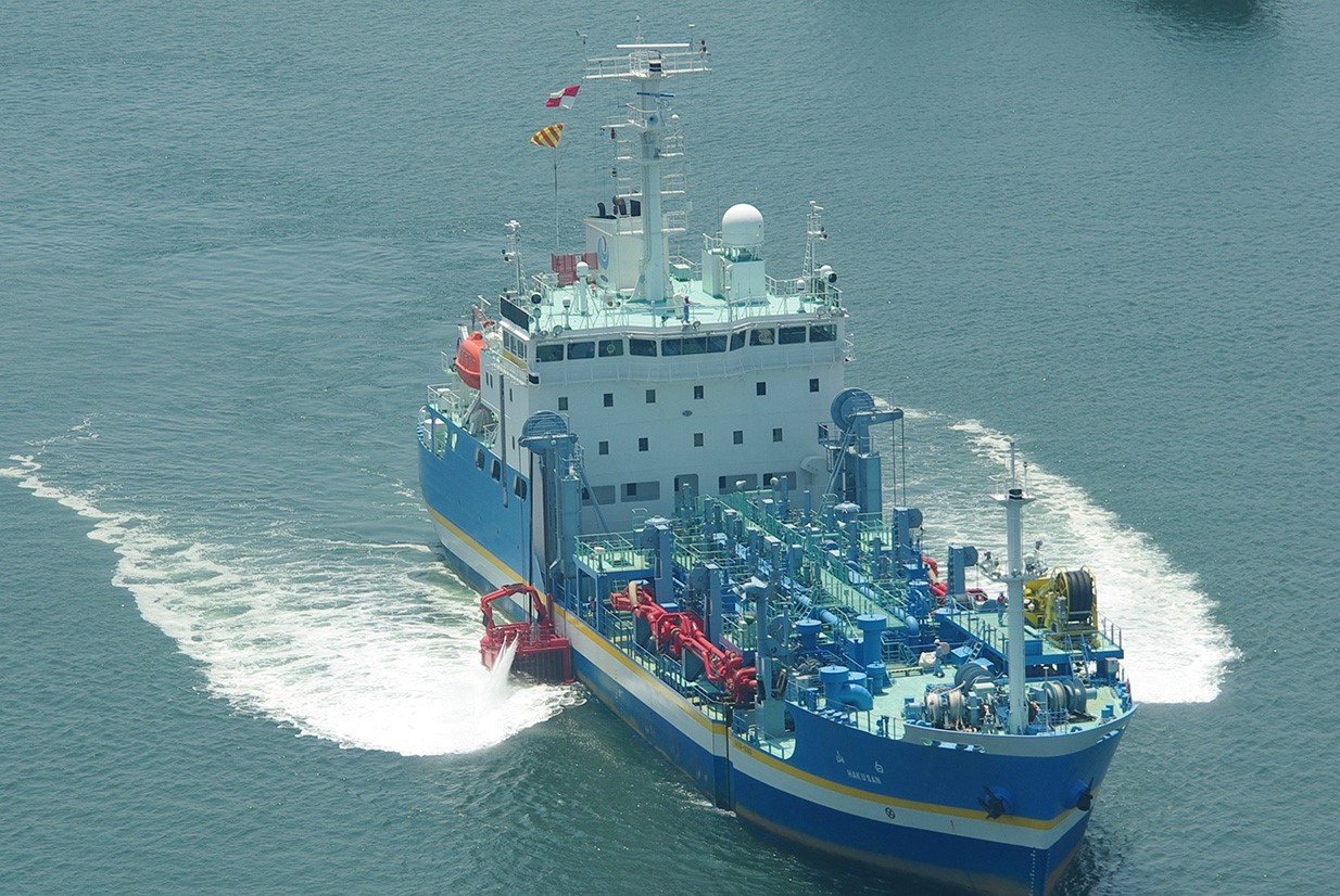 4月18日16時15分に新潟港を出航し、日本海を熊本方面へ向かって航行中の大型浚渫兼油回収船「白山(はくさん、4,185トン)」は、21日(木)6:40に博多港に入港します。