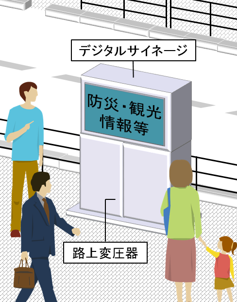| ○無電柱化された道路の歩道上にある路上変圧器を有効活用し、防災・観光情報等を 提供することにより、官民連携での地域防災力の向上や観光振興が期待されます。 ○このため、路上の広告物に関する占用許可基準を緩和し、既設の路上変圧器を活用 した防災・観光情報等の提供に関する有用性を検証するための実証実験地域を公募 しました(H30.12.10~H31.1.17)。 ○公募の結果、2地域から企画提案があり、内容を確認し、いずれの地域も選定すること としました。 |