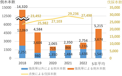 | 【調査結果】 〇総倒木本数 年平均 約 5,200 本 ・強風等の災害による倒木 年平均 約 3,700 本 ・強風等以外の要因による倒木 年平均 約 1,500 本 〇点検結果に基づく伐採本数 年平均 約 26,700 本 |
