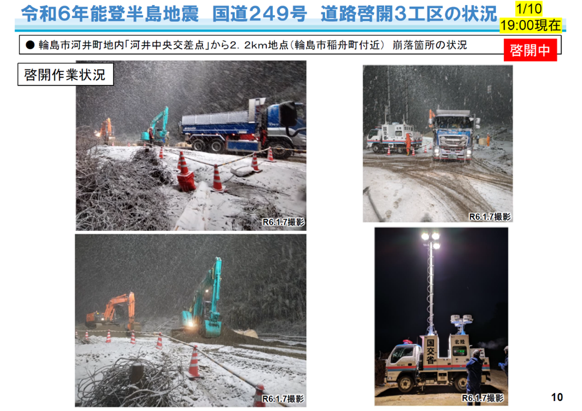 | 令和6年能登半島地震により被害を受けた能登半島における緊急復旧(道路啓開)について、1月10日(水)までの作業状況を特設サイトで公表しました。引き続き、緊急復旧(道路啓開)の進捗状況、作業状況について随時更新してまいります。 |