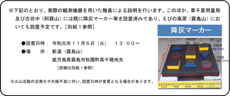 このため、立入規制区域内での降灰量調査手法の検討を行い、この度、降灰マーカー等※2を用いた降灰量調査を阿蘇山と霧島山で試行的に実施することになりました。