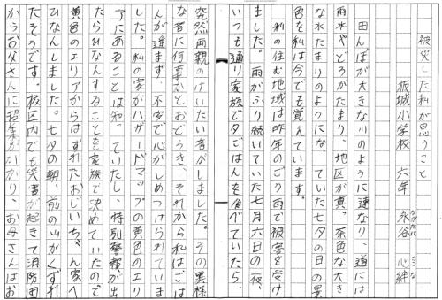 | 広島県 東広島市立板城小学校 6年 永谷 心絆 「被災した私が思うこと」 |