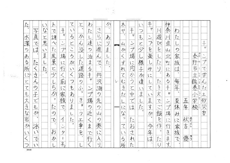 | 神奈川県 秦野市立鶴巻小学校 5年 秋吉 優 「キャンプで学んだ土砂災害」 |