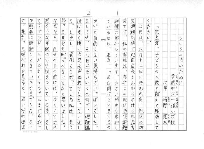 | 宮城県 栗原市立一迫小学校 6年 崎野 寛太 「もしもの時のために」 |