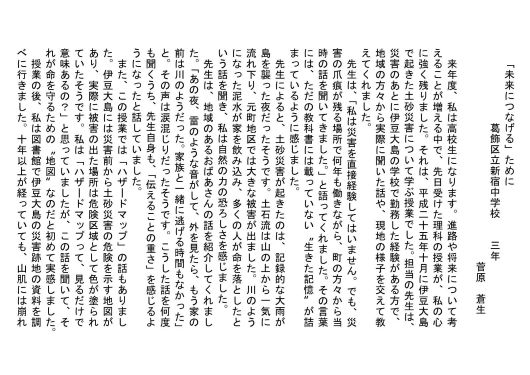 | 東京都 葛飾区立新宿中学校 3年 菅原 蒼生 「「未来につなげる」ために」 |