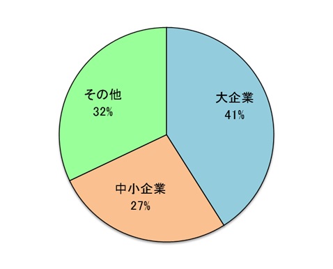 ![]() ※大企業および中小企業は、中小企業基本法の分類(製造業その他)を参考に、「資本金の額又は出資の総額が3億円以下の会社又は常時使用する従業員の数が300人以下の会社及び個人」で分類。なお、株式会社および有限会社以外の組織はすべて、その他団体とした。 |