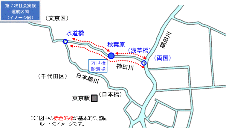 秋葉原(万世橋船着場)を中心として、上流方面(西側)は日本橋川合流あたり、下流方面(東側)は隅田川合流付近までの神田川を周遊します。およそ10日間の実験です。短時間で、手軽な周遊プランとしておりますので、ご興味のある皆様方多数の参加をお待ちいたします。実験運航の概要は以下をご参照下さい。