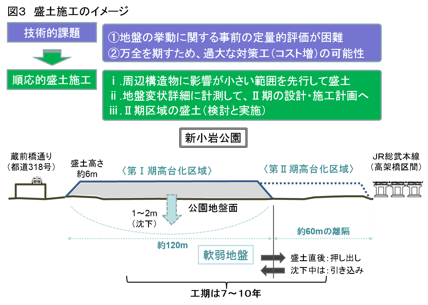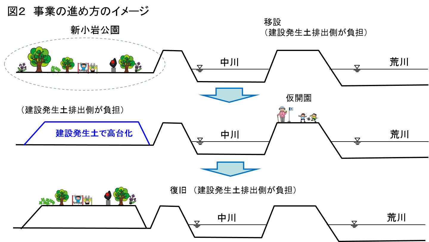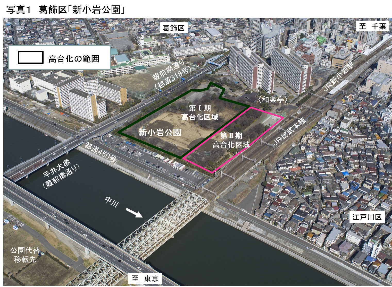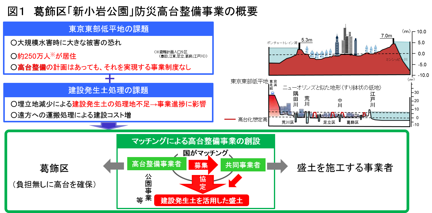| 東京東部の低平地に広がるゼロメートル地帯には、大規模な水害時に緊急的な避難地となる高台が無く、その整備が強く望まれています。 一方、今後も様々な事業から大量の建設発生土が生じることが見込まれています。 葛飾区「新小岩公園」(JR総武線新小岩駅北口)※1について、自らの事業による建設発生土を利活用し、当該公園の盛土施工等を実施する事業者を今般『公募』するものです。※2 (※1.写真1参照。 ※2.図1参照)