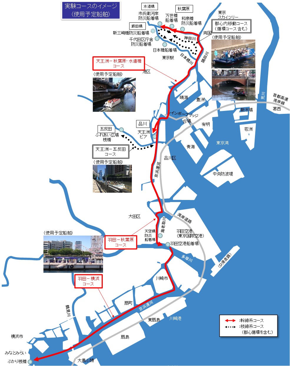 〈舟運社会実験の経緯とポイント〉 ![]() (実験の背景・目的) 舟運社会実験は、約90年前から存立するインフラ「万世橋船着場」(国道17号・秋葉原)の有効活用の可能性の検討をキッカケにして、同船着場の拠点性に着目して羽田空港まで一気に結ぶ航路の設定等を検討・実施してきたものです。舟運の活発化が地域や街全体がより元気づく相乗的効果も期待しています。 実験では、東京都心と臨海部を結び観光とおもてなしを同乗させた水上移動手段として民間による新たな定期航路として運航する可能性を検証することを最大の目的として取り組んできました。 (実験の実施主体) 本実験は『秋葉原・天王洲・羽田空港舟運プロジェクト準備会』で取り組んできました。同準備会では運航事業者と地域の応援団を公募しながら検討や実験実施を進めてきており、現在は準備会の29の機関・団体・企業等、多様な分野の構成員による集合体となりました。 (これまでの実験概要) 初回実験は昨年9月、秋葉原(万世橋船着場)と羽田空港船着場を結ぶ1ルートの設定で実施し、7日間の実運航中に約1,500名の方に乗船頂きました。 第2次実験はまだ肌寒い冬の季節、今年2月に「神田川ミニクルーズ」として実施し、同じく7日間で約320名の方に乗船頂きました。 第3次実験は、ゴールデンウィークに漕ぎ出して今年5月~6月に実施しました。5つの運航事業者による多様な6つのコースを設定した期間中は、約1,800名の方に乗船頂きました。また、第3次実験からは「地域の応援団」によるおもてなしや実験運航の盛り上げ活動も動き出しました。 〈運航日時・料金設定・お申し込み先〉 第4次実験では、5つの運航事業者が多様なコースを設定しました。30日間以上、約100便の船が各船着場や街を結ぶ予定です。 移動距離の長いコースの「幹線系」、比較的近距離を移動する「枝線系」を基本コースとしつつ、一つのエリア内を巡る「クルーズ系」の設定もあります。 「幹線系」コースは、羽田空港-秋葉原と天王洲-秋葉原・水道橋を結ぶ2コース、「枝線系」コースでは神田川・隅田川・日本橋川の複数の船着場を結び都心を循環移動するコース設定です。なお、羽田空港→横浜間の工場夜景コースを限定で設定する予定です。実験コースや運航日時等は以下のイメージ図と運航概要表をご参照下さい。 参加のお申し込みや検討に際しては、各コースのお申し込み先にて日時・料金内容も十分にご確認下さい。 なお、荒天時は運休する場合もありますので予めご了承下さい。 ![]()