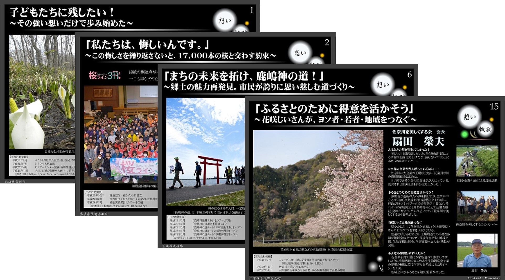 | 国土交通省は、この度、地域づくりに携わる人たちの想いと軌跡をとりまとめ、公表しました。 今回とりまとめたのは、地域づくり活動の成果ではなく、地域づくりに携わる人たちの想い、活動を始めたきっかけ、苦労や歩んできた軌跡にスポットライトを当てたもので、今も継続している活動です。様々な地域づくりに関わる方々に共感いただくことで、“次の行動”のきっかけやヒントにしていただくことを目的としてとりまとめました。 32団体の想いと軌跡を掲載していますので、地域づくりに関わる方々は是非ご覧ください。 |
