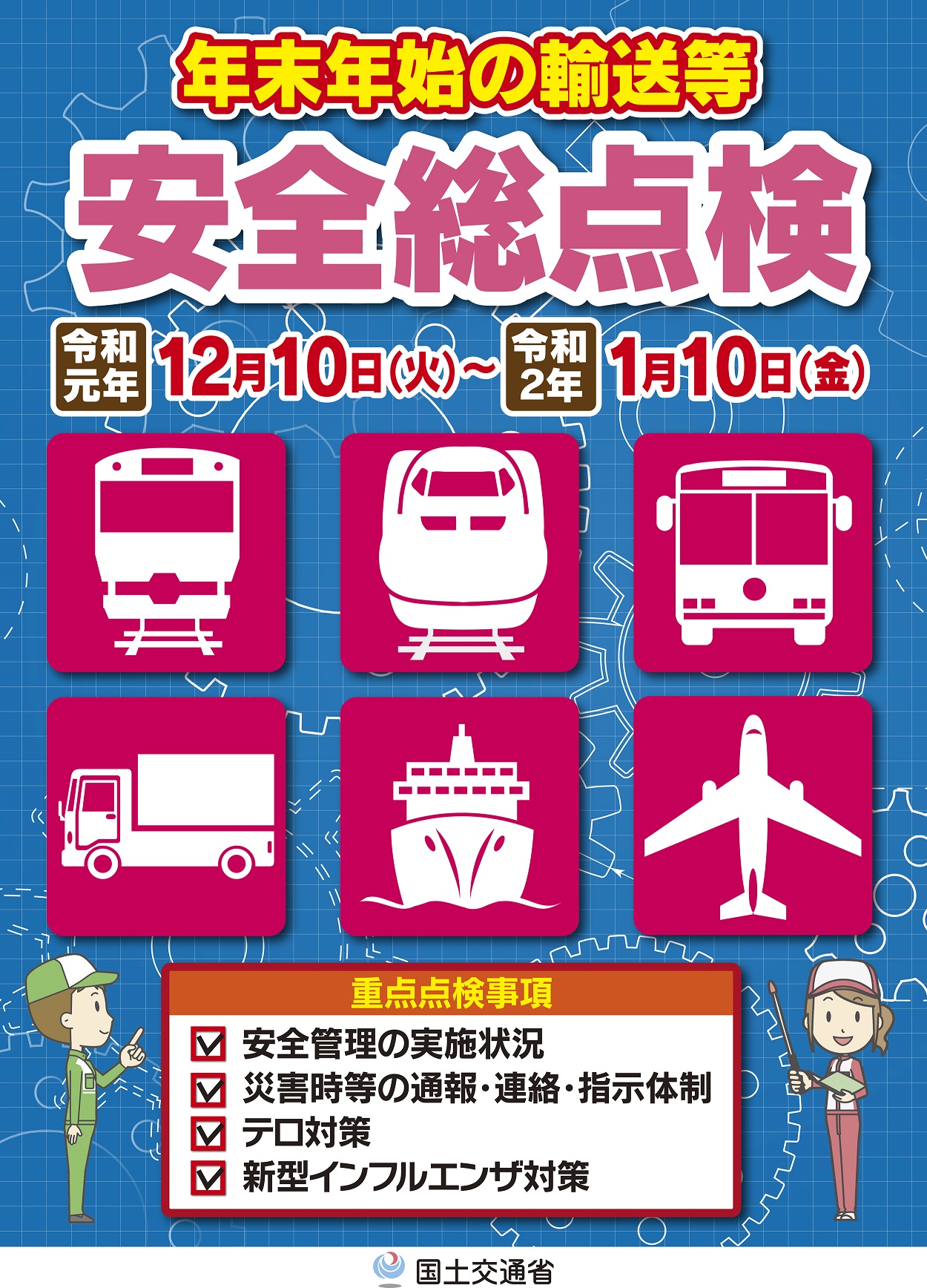 国土交通省では、多客繁忙期である年末年始に、陸・海・空の輸送機関等が安全対策の実施状況等を自主点検することにより、公共交通の安全を図るとともに、輸送機関等の安全に対する意識を高めることを目的とする「年末年始の輸送等に関する安全総点検」の取組を実施します。