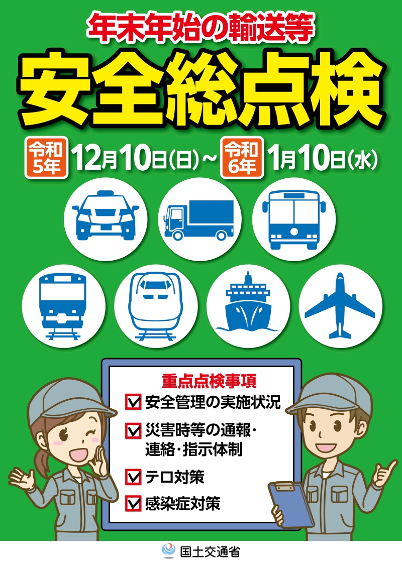 国土交通省では、多客繁忙期である年末年始に、陸・海・空の輸送機関等が安全対策の実施状況等を自主点検することにより、公共交通の安全を図るとともに、輸送機関等の安全に対する意識を高めることを目的とする「年末年始の輸送等に関する安全総点検」の取組を実施します。