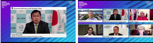 | 令和3年4月7日、赤羽国土交通大臣は、世界経済フォーラム傘下のイノベーションの社会実装に関する国際会議「Global Technology Governance Summit(GTGS)」第1回会合のセッション「経済復興とスマートシティ」に出席しました。セッションでは、IoT、AI やビッグデータを活用したスマートシティ・スマートモビリティに関する日本の事例を紹介し、ポスト・コロナにおける経済成長について議論を行いました。 |