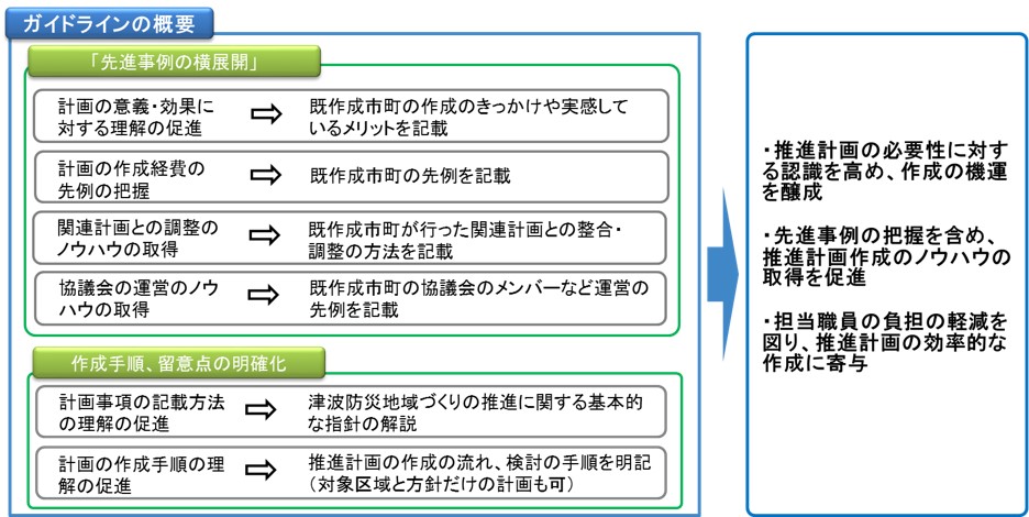 津波防災地域づくりに関する法律に基づき、地域の実情に応じて津波防災地域づくりを総合的に推進するための計画(推進計画)の市町村による作成を促進するため、既に推進計画を作成または現在作成を検討中の団体へのヒアリング結果を踏まえ、参考となる先行事例、推進計画の作成手順や留意点を明記したガイドラインを策定しました。