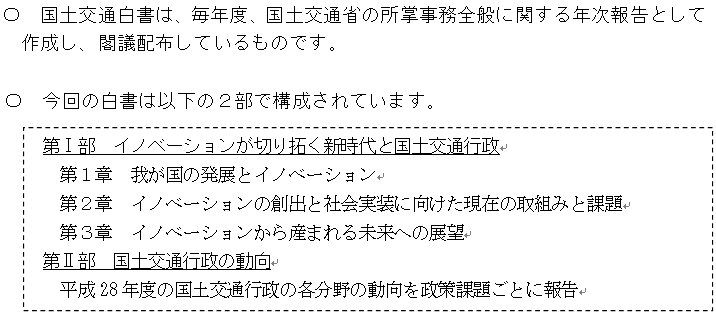 | 国土交通省では、本日、平成28年度国土交通白書を閣議で配布し、公表します。 今回の白書では、“イノベーションが切り拓く新時代と国土交通行政”をテーマに、国土交通省において現在取り組んでいる、i-Constructionや自動走行等の先進的な取組事例を紹介し、今後のイノベーションの創出と社会実装に向けた国土交通分野における課題、未来に向けた国土交通行政の役割について記述しております。 |
