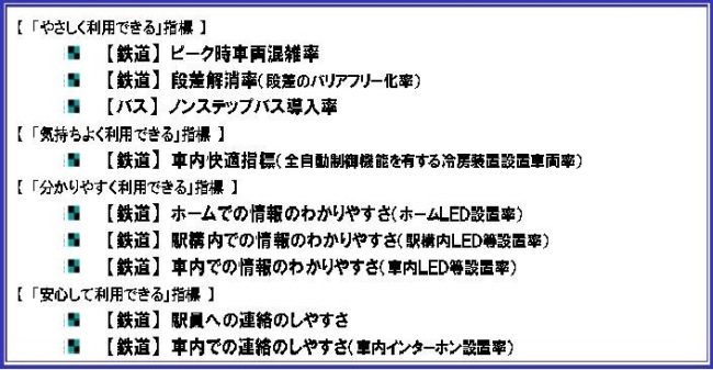 関係者の協力を得て、計9項目の指標について首都圏の鉄道事業者、バス事業者を対象とした具体的な数値をとりまとめてきたところですが、今年度は、近畿圏についても対象としてとりまとめることとなりました。