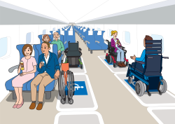 隣の座席への移乗の有無や介助者等の有無、ストレッチャー式車椅子利用者など様々な障害の状態等に対応し、車椅子利用者がグループで快適に旅行等を楽しめるよう、「車椅子用フリースペース」を一般客室に設ける。