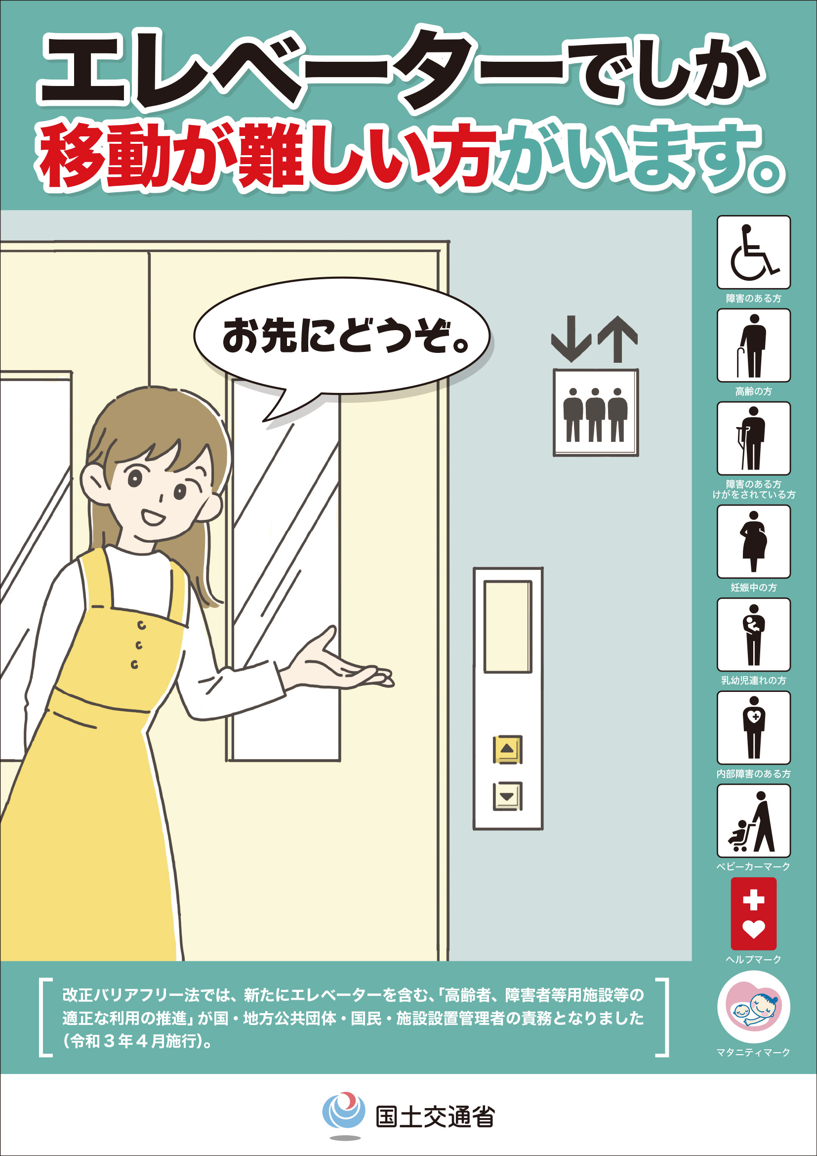 | ~高齢者障害者等用施設等の適正利用推進キャンペーン~ 【キャンペーン期間】 令和3年12月3日(金)~令和4年1月7日(金) ※12月3日(金)~12月9日(木)(障害者週間) 【キャンペーン内容】 ■ポスターの一斉掲示及びチラシの配布(別紙) ※協力依頼先・・・公共交通事業者等、ショッピングセンター、百貨店、ビル、道の駅、高速道路会社 、地方公共団体等 ■国土交通省の公式ツイッター等を活用し、キャンペーン実施の周知 ■バリアフリー教室における高齢者障害者等用施設等の適正利用に関する講座の開催 |