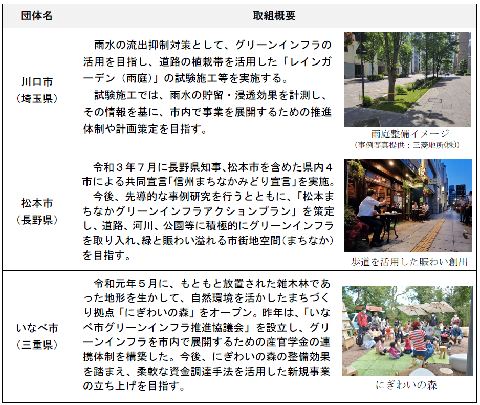 | 〇 国土交通省では、「先導的グリーンインフラモデル形成支援」の重点支援団体として、 グリーンインフラに取り組む地方公共団体3地域を決定しました。 〇 重点支援団体に対しては、コンサルタントや専門家の派遣等を通じて、計画づくりや 推進体制の構築等を支援し、官民連携によるグリーンインフラの実装を加速します。 |