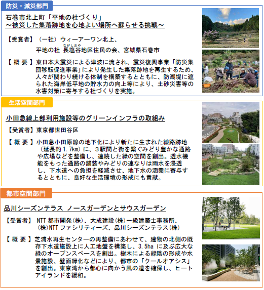 | グリーンインフラ官民連携プラットフォームでは、第3回グリーンインフラ大賞に ついて、全国から応募のあった41件の取組事例の中から、会員の皆様の投票等により 各部門において合計4件の「国土交通大臣賞」を決定しました。 表彰式は、グリーンインフラ産業展2023(令和5年2月1日開催)において実施 する予定です。 |