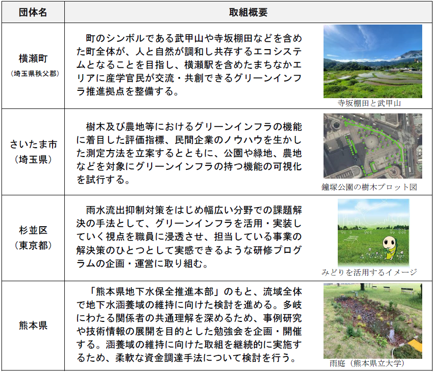 | 国土交通省では、「先導的グリーンインフラモデル形成支援」の重点支援団体として、 グリーンインフラに取り組む地方公共団体4地域を決定しました。 重点支援団体に対しては、コンサルタントや専門家の派遣等を通じて、計画づくりや 推進体制の構築等を支援し、グリーンインフラの実装を加速します。 |