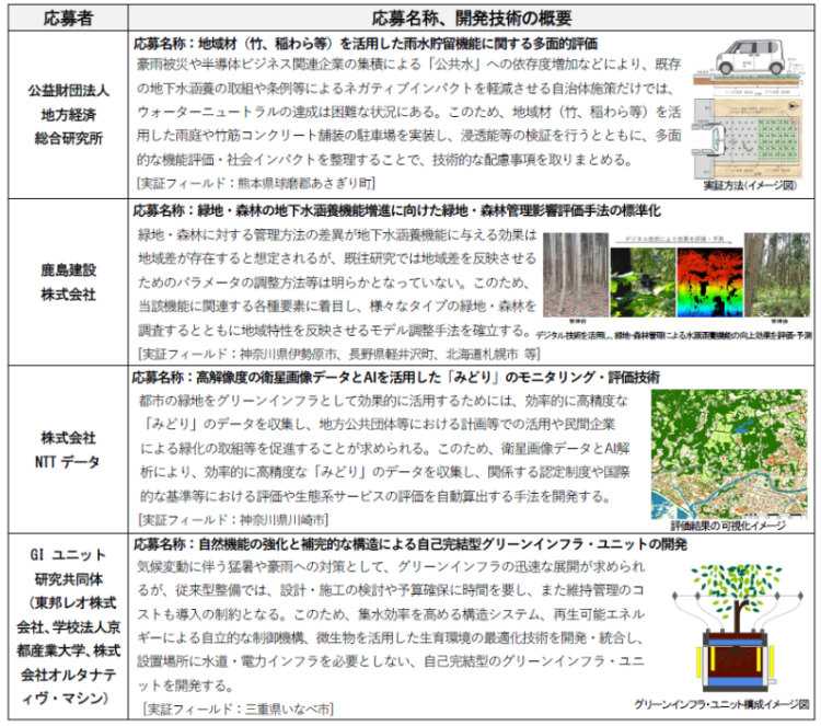 | 民間企業が有する新たなグリーンインフラ技術の実証を行う「グリーンインフラ創出促進事業」 の公募を行い、審査の結果、4事業を選定しました。 今後、当該技術等を用いて、実証フィールドでの検証を行い、その実用可能性などをとりまとめ る予定です。 |