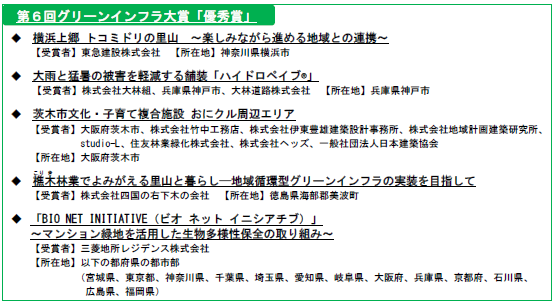 グリーンインフラ官民連携プラットフォーム(事務局:総合政策局環境政策課)では、第6回グリーンインフラ大賞について、全国から応募のあった多数の取組事例の中から「国土交通大臣賞」2件、「GREEN×EXPO賞」1件、「特別優秀賞」3件、「優秀賞」5件を決定しました。