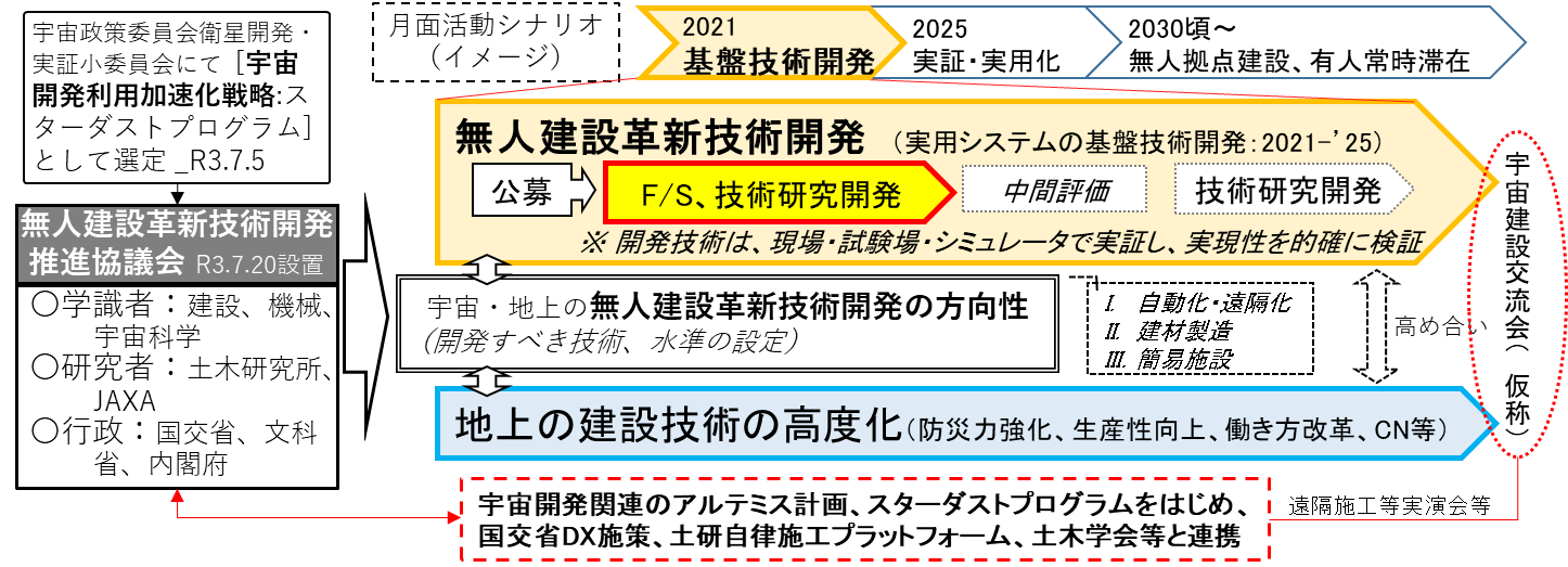 | 「宇宙開発利用加速化戦略プログラム」(スターダストプログラム)の一環として、令和3年7月に開始した「宇宙無人建設革新技術開発推進事業」(国交省及び文科省連携)において、新たに技術研究開発の実施対象『新規分』(計3件)を決定しました。【別紙1】 [無人建設(自動化・遠隔化)に係る技術:2件、簡易施設建設に係る技術:1件(いずれも実現可能性検証(F/S))] 今後、省庁連携「無人建設革新技術開発推進協議会」【別紙2】の体制の下、令和4年6月に決定した『継続・移行分』(計 10 件)を加えた13件の技術研究開発を進めます。 また、他の宇宙関連事業とも連携し、地上の建設技術の高度化に展開するため、広く宇宙と建設の関係者を募り、「遠隔施工等実演会」(仮称)等の活動を予定しています。 |