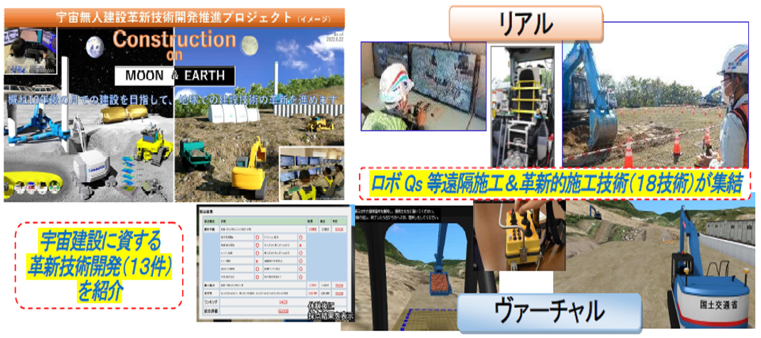 | 災害対応、生産性向上に加え、将来的な宇宙開発に資する遠隔施工等の革新的施工技術について、各種技術及び技術者が集まり、実フィールドでの実演を通じて、そのノウハウを共有し、技術の普及、技術力向上、更なる技術開発を促進します。(全18技術の実演) |