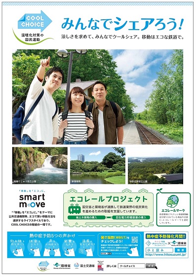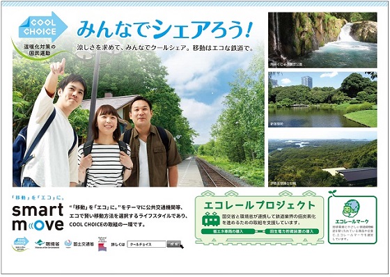 今般、国土交通省が推進している、エコな鉄道をもっとエコにする「エコレールプロジェクト」と、環境省が推進している、低炭素型の「製品」「サービス」「ライフスタイル」など、温暖化対策に資するあらゆる「賢い選択」を促す新しい国民運動「COOL CHOICE」が、それぞれの取組みの普及啓発を図るため、合同でポスターを作成いたしました。今後、全国の駅や電車内に掲出される予定です。