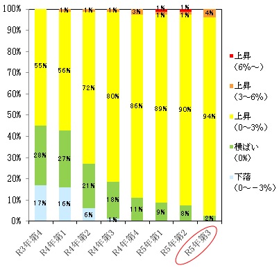主要都市の高度利用地等における地価動向※は、景気が緩やかに回復している中、マンション需要の堅調さに加え、店舗需要の回復傾向が継続したことなどにより、4期連続で全ての地区において上昇又は横ばいとなった。住宅地では、6期連続で23地区全てで上昇した。