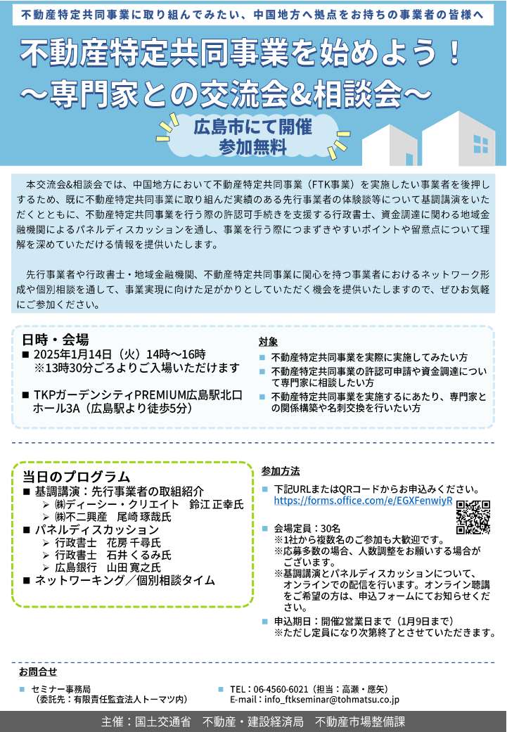 国土交通省は、地域における不動産特定共同事業の運営にご興味をお持ちの方や実際に実施してみたい事業者の方等を対象に「不動産特定共同事業を始めよう!専門家との交流会&相談会」を開催します。