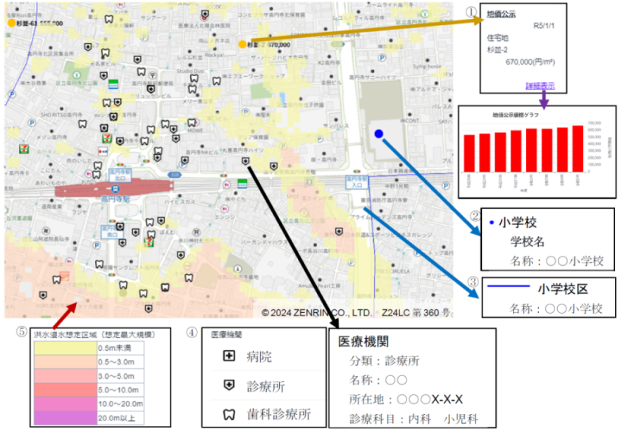 「ライブラリ」の背景地図に、[1]令和5年地価公示、[2]学校、[3]小学校区、[4]医療機関、