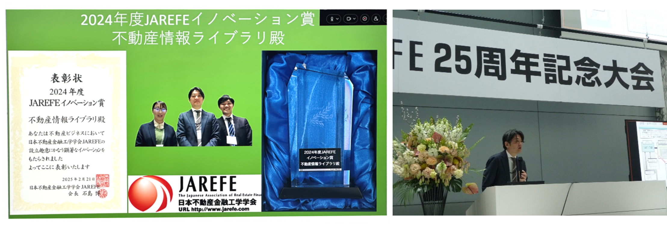 令和7年2月21日(金)に開催されたJAREFE(日本不動産金融工学学会)25周年記念式典にて、不動産情報ライブラリがJAREFEイノベーション賞(JAREFE Innovation Award)を受賞しました!